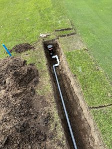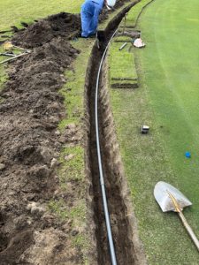 これから気温が上がり乾燥しやすくなる季節に備え、グリーンのコンディション維持を目的としてスプリンクラーの増設を進めています。特に水分が抜けやすい箇所や風当たりの強いエリアでは、従来の散水だけではカバーしきれない場面も多く見られるため、より均一で効率的な散水ができるよう改善を図っています。