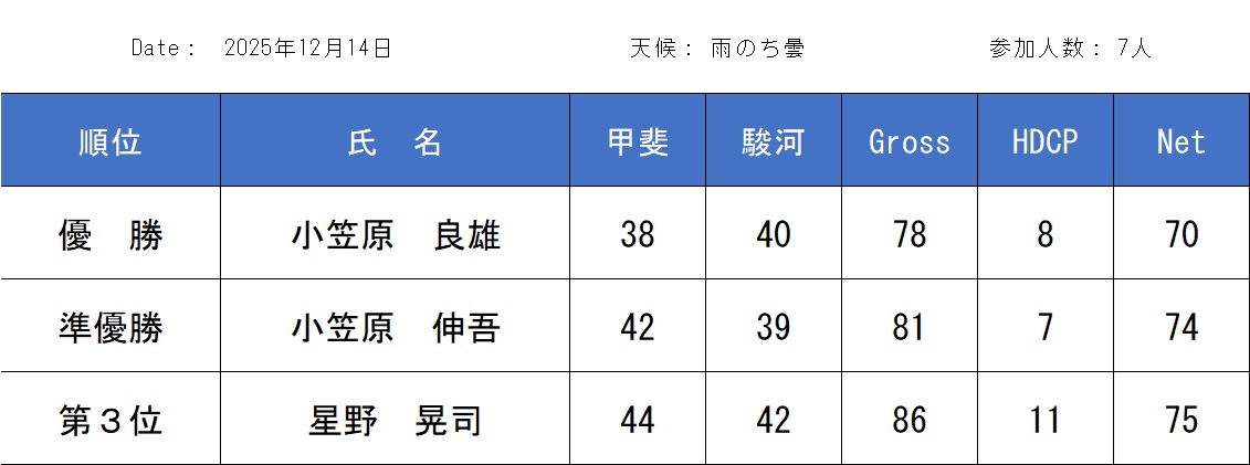 アーカイブ 2026 2025 2024 2023 2022 2021 2020 2019 2018 2017 2016 COMPETITION 最新の結果 2025.12.14 グランドマンスリー杯 優勝 小笠原 良雄 様 2025.12.07 12月度月例杯 優勝 清 正光 様 2025.10.19 令和7年シニア選手権 優勝 齋藤 基樹 様 2025.10.05 10月度月例杯 優勝 伊勢川 芳治 様 2025.09.29 9月度月例杯 優勝 望月 一成 様 2025.09.14 令和7年 クラブ選手権 優勝 前田 高志 様 2025.08.06 8月度平日月例杯 優勝 杉本 忠義 様 2025.08.03 8月度月例杯 優勝 山田 貞二 様 2025.07.27 令和7年 キャプテン杯 優勝 後藤 芳 様 2025.07.06 7月度月例杯 優勝 海野 達哉 様 次のページへ 次へ